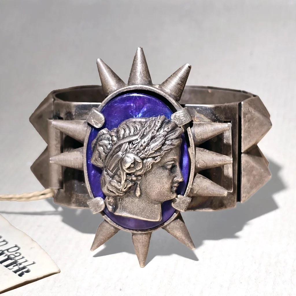 A Jean Paul Gaultier cuff bracelet combining classical antiquity with punk-inspired spikes, featuring a female profile set on a deep purple cabochon stone.