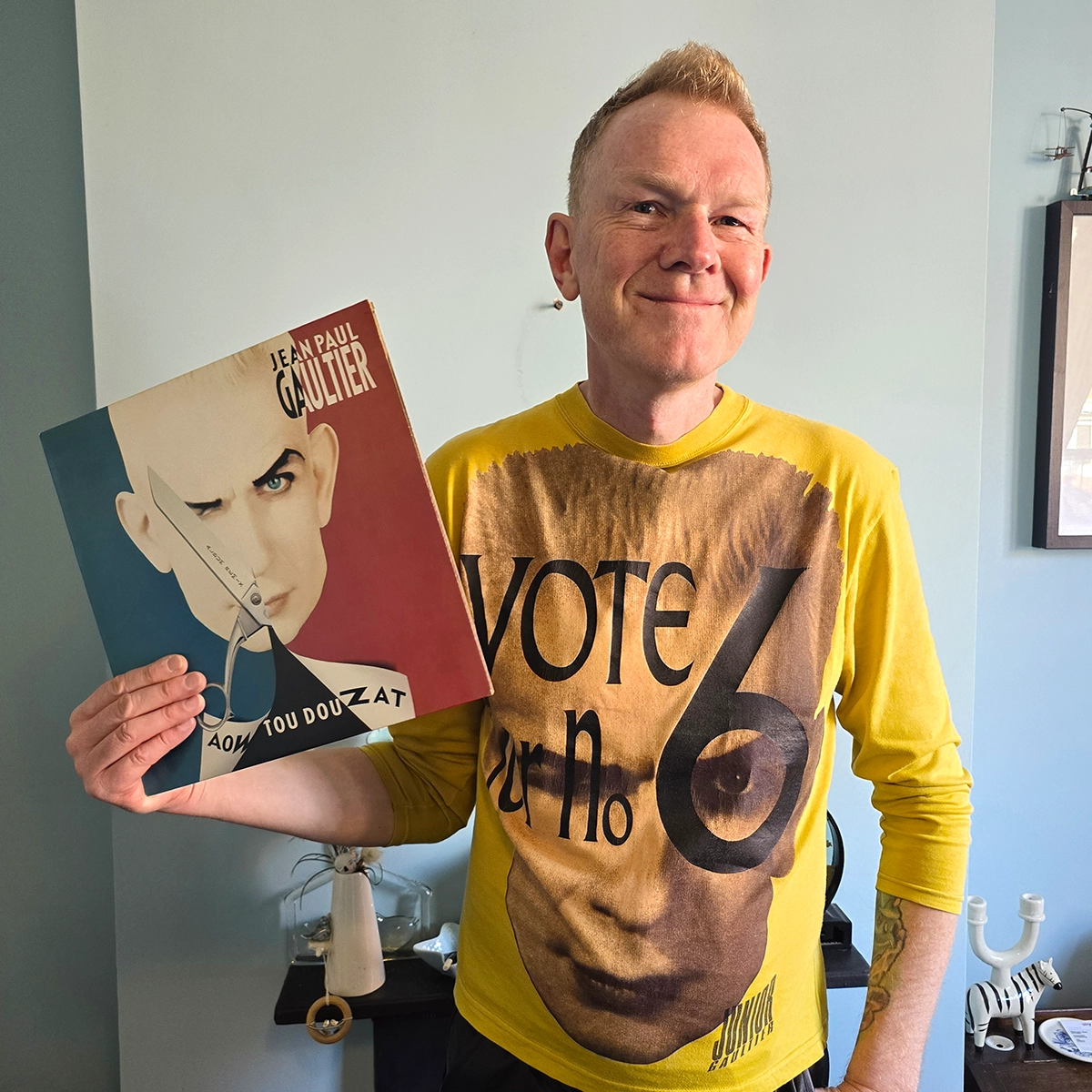Left: Cover of Gaultier’s single, “Aow Tou Dou Zat”. © Jean Paul Gaultier. Right: Embroidered Junior Gaultier patch. Photo used with permission from @stanislas_jacobb